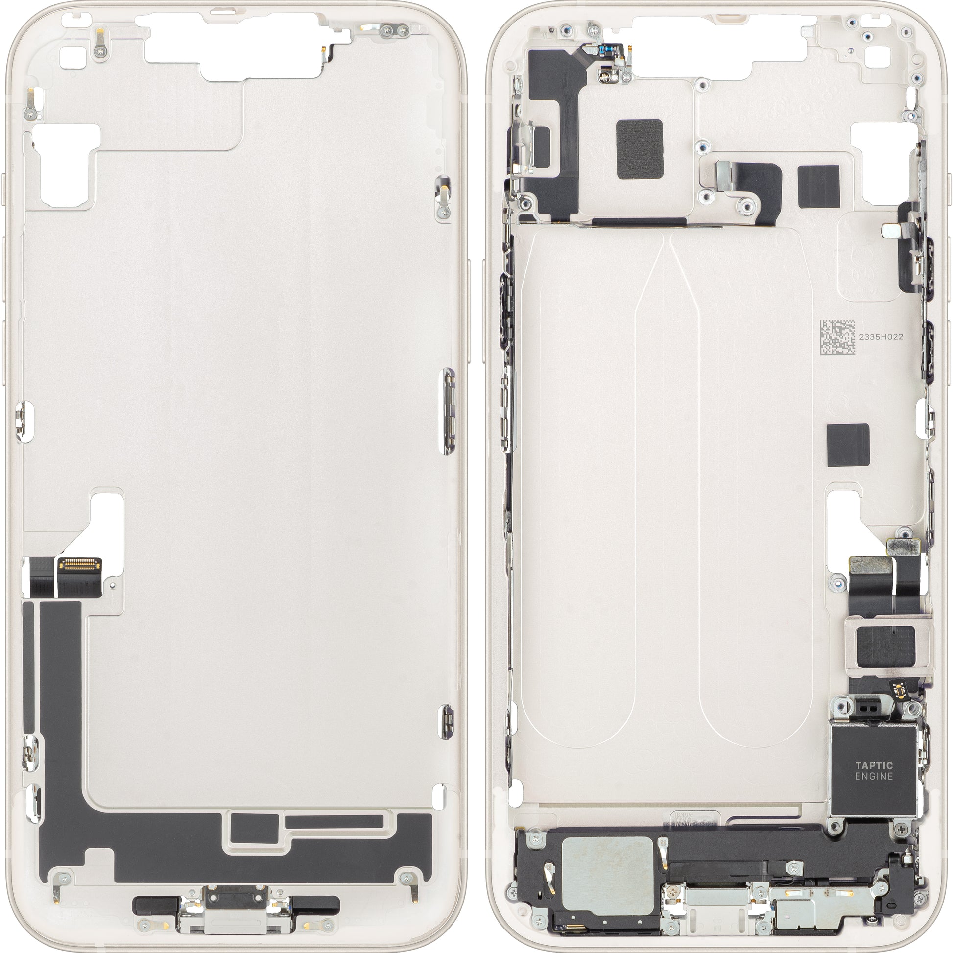 inductive coil for wireless charging, taptic engine, charging connector strip, buzzer, and battery adhesive.