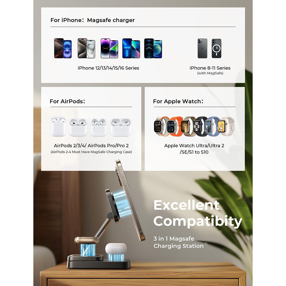 • Ideal for iPhone, Apple Watch, and AirPods, the station offers a unified MagSafe charging solution, allowing each device to be intuitively and stably positioned on the dedicated module.