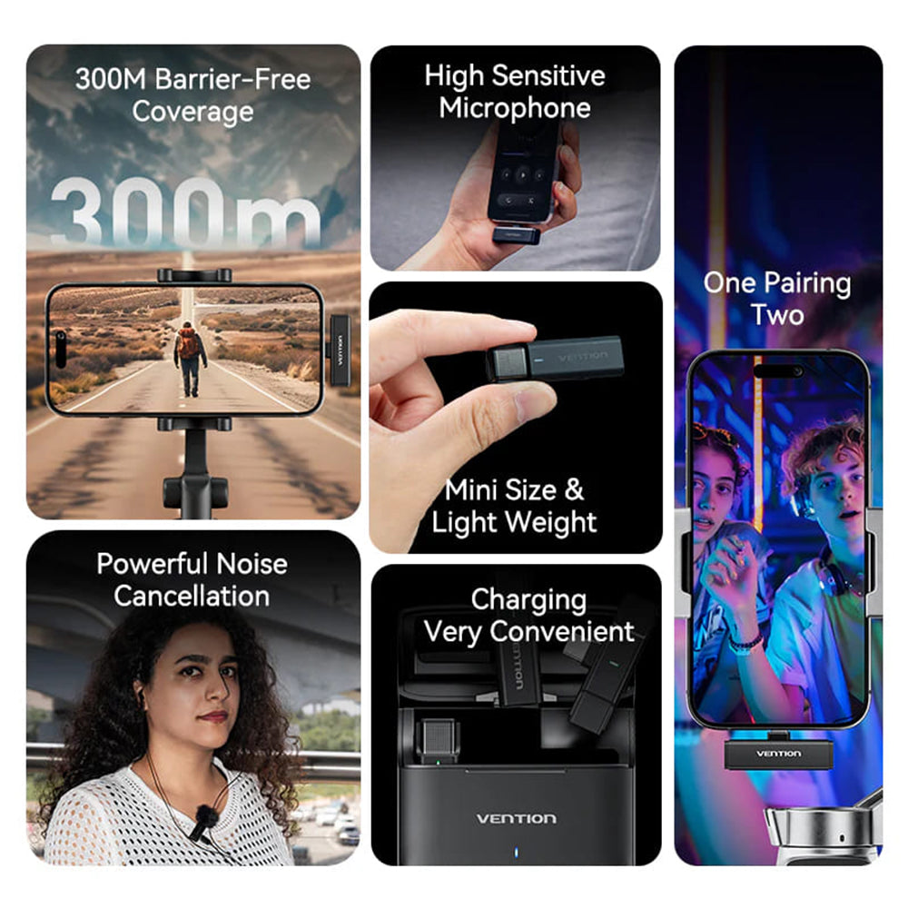 Vention has created the best premium microphone lavalieres! They perfectly reproduce sounds and eliminate background noise thanks to the Noise Cancelling function. Take them with you anywhere! Do you like to present information directly from the source of events? Well, these wireless lavalieres are compact and feature a premium case. Perfect synchronization! The new lavalier and Type-C receiver kit is designed for dual audio recordings of the highest quality. Specifications: Material: ABS, polycarbonate; Plug: Type-C; Frequency: 20Hz - 20KHz; Microphone battery capacity: 100mAh; Case battery capacity: 600mAh; Current input: 5V; Transmission distance: 300m; Usage time: 7 hours; Lavalier dimensions: 47.5 x 15.2 x 16mm; Type-C receiver dimensions: 47.7 x 13.6 x 7.9mm; The package contains: 2x lavalieres, 1x Type-C receiver, charging case.